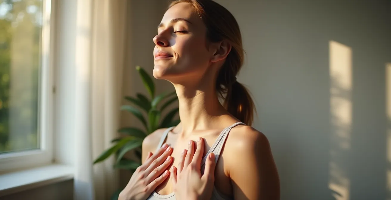 Cuando el pánico se activa, su respiración se vuelve corta y superficial, lo que agrava la sensación de ahogo y acelera el ritmo cardíaco. Intentar «respirar hondo» sin una estructura a menudo conduce a la hiperventilación. La solución es una técnica precisa y rítmica que actúa como un interruptor para su sistema nervioso: la respiración en 4 tiempos, también conocida como respiración cuadrada o una variante de la técnica 4-7-8.